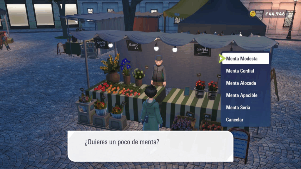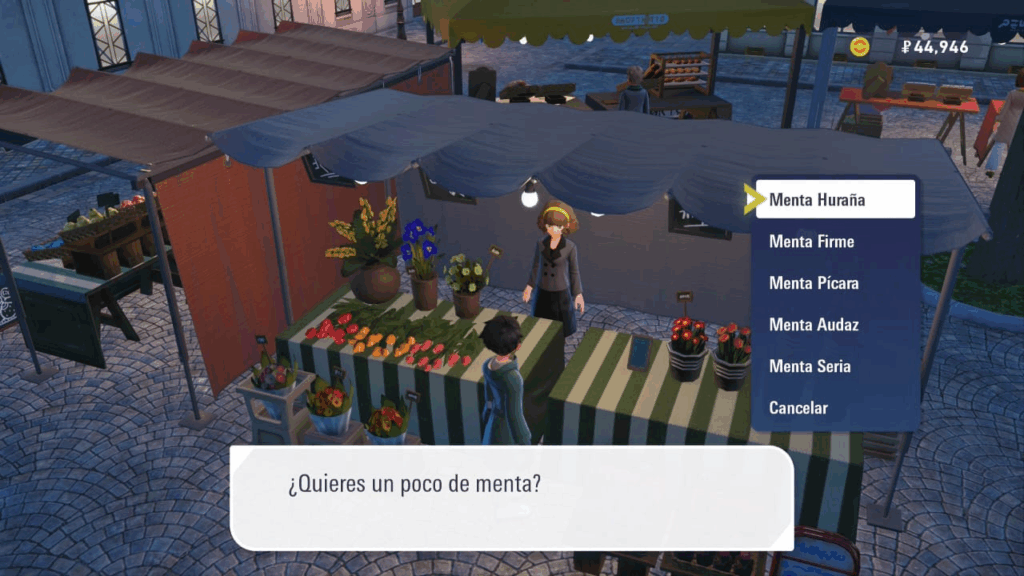 - Comprándolas en puestos específicos: La forma más directa de obtener la Menta que necesitas es acudir a los puestos con aspecto de floristería dispersos por los distritos de la ciudad. Todas las Mentas tienen un precio único de 20,000 Pokédólares . Es un precio considerable, por lo que se recomienda vender objetos tesoro o equipar el Amuleto Moneda para aumentar las ganancias de las batallas.