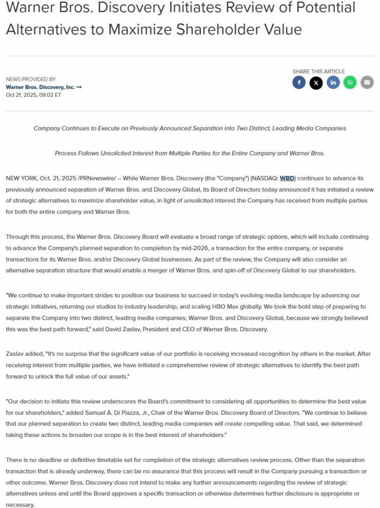La noticia de la posible venta llega en un momento crucial, justo cuando la compañía estaba enfocada en su plan estratégico de separarse en dos entidades distintas para 2026: Warner Bros. Studios (centrada en cine, TV, DC y la plataforma Max) y Discovery Global (enfocada en canales de cable y redes globales). Según el CEO, David Zaslav, esta división buscaba aumentar la valoración de sus activos. Sin embargo, el «creciente reconocimiento» del valor de su portafolio ha llevado a WBD a considerar ahora una transacción que cubra toda la compañía o transacciones separadas para sus negocios ya planeados.